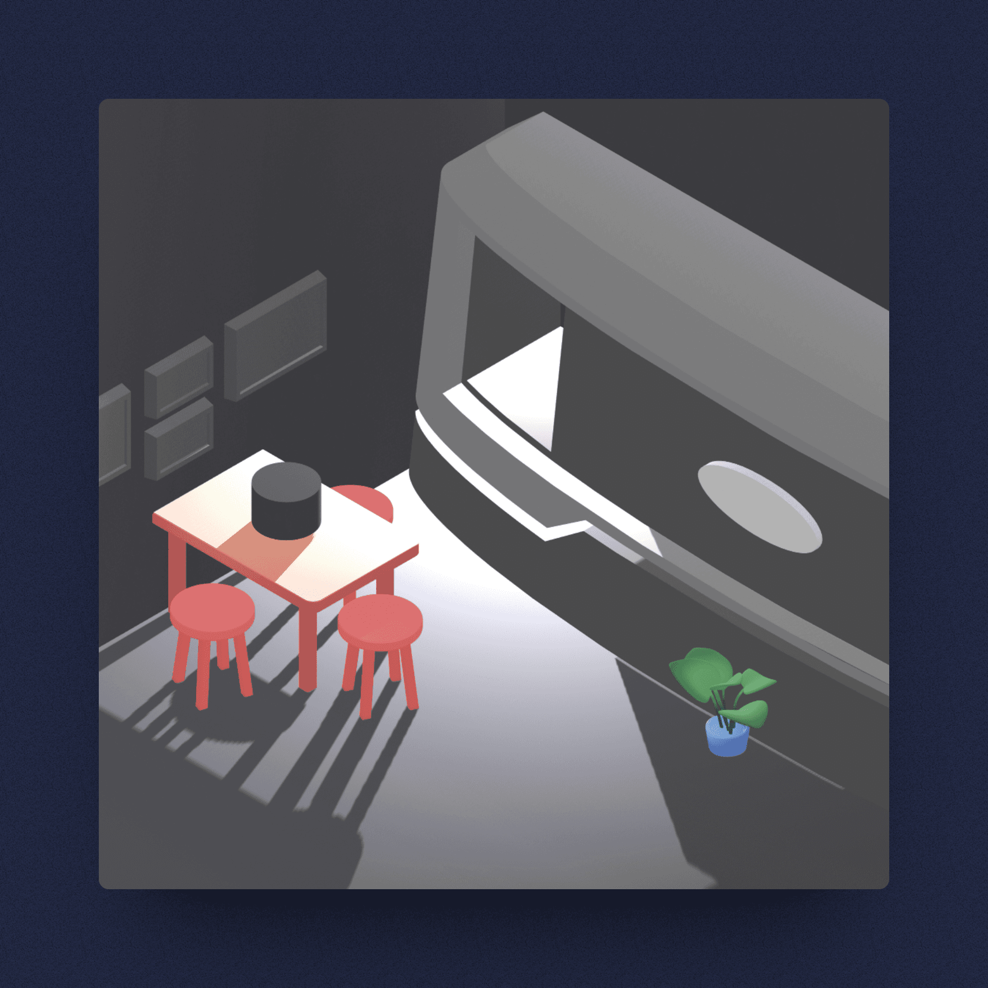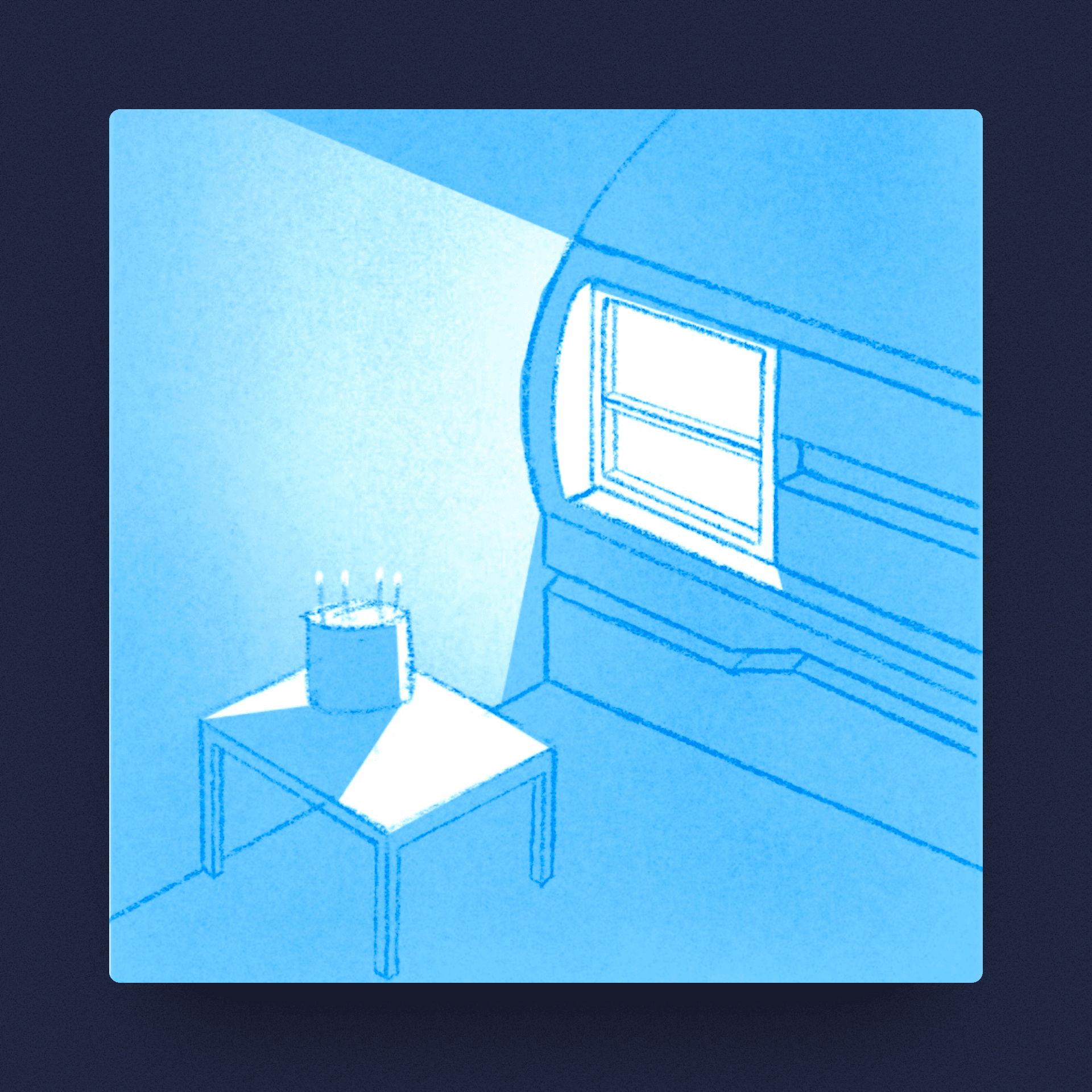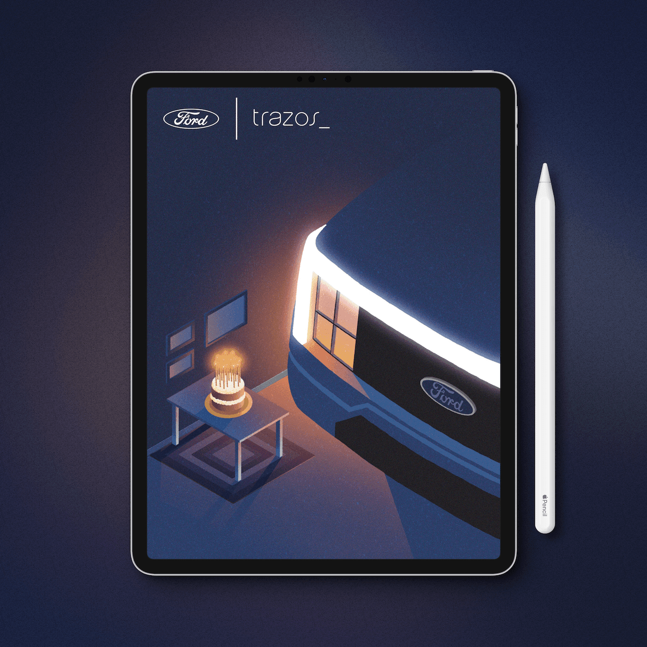 Crear una ilustración que cumpla con los requisitos utilizando un vehículo eléctrico, que a su vez se fusiona con una ventana que evoca su lema "Acercando el Mañana," y en conmemoración de su aniversario, se representa con un pastel contemplando el amanecer.